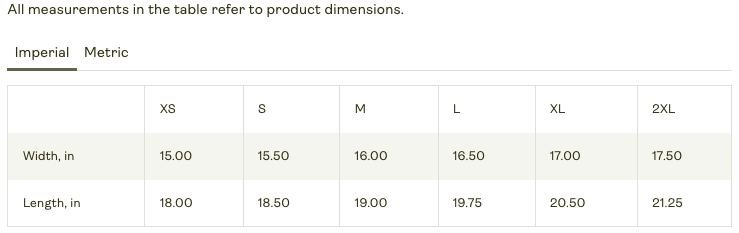 All measurements in the table refer to product dimensions.