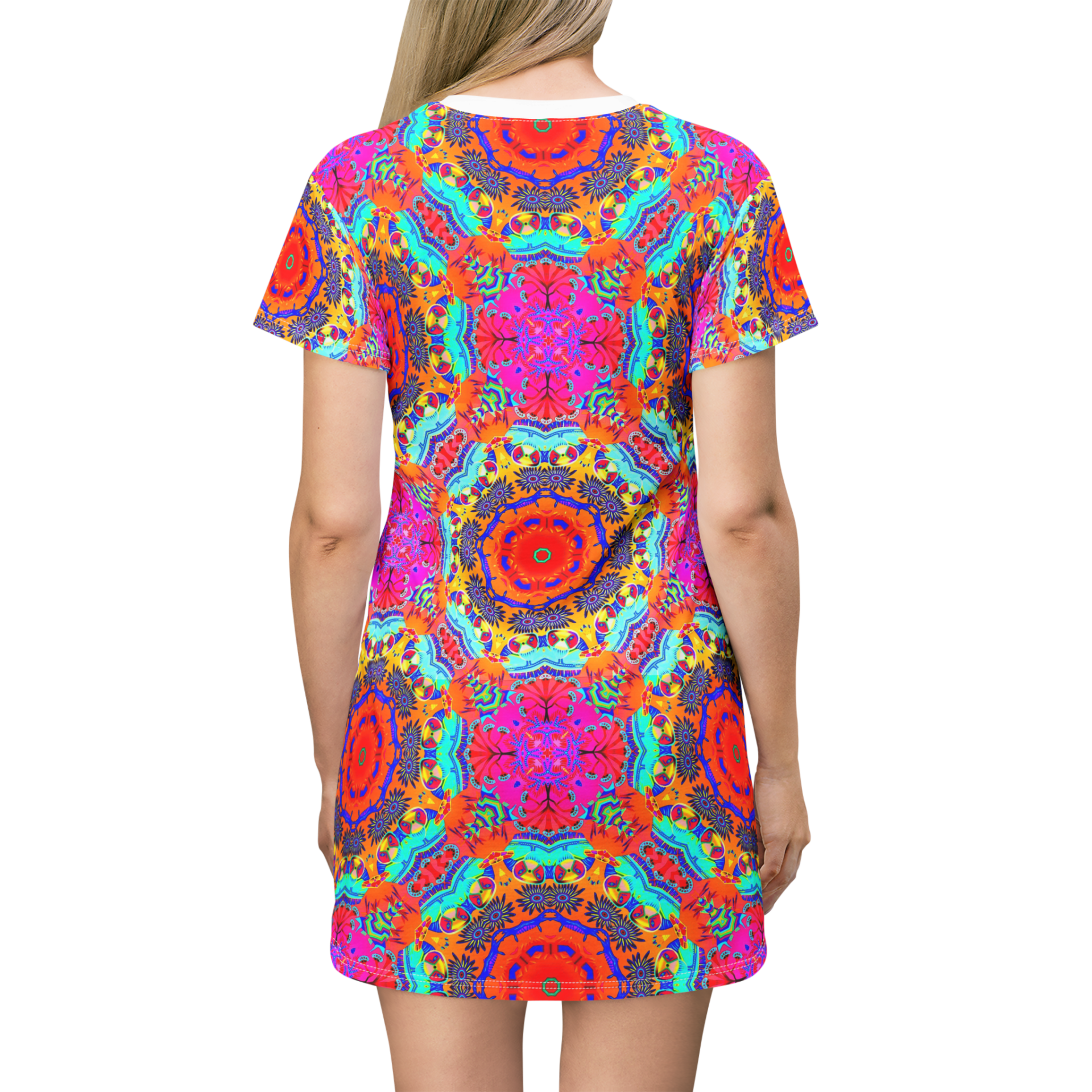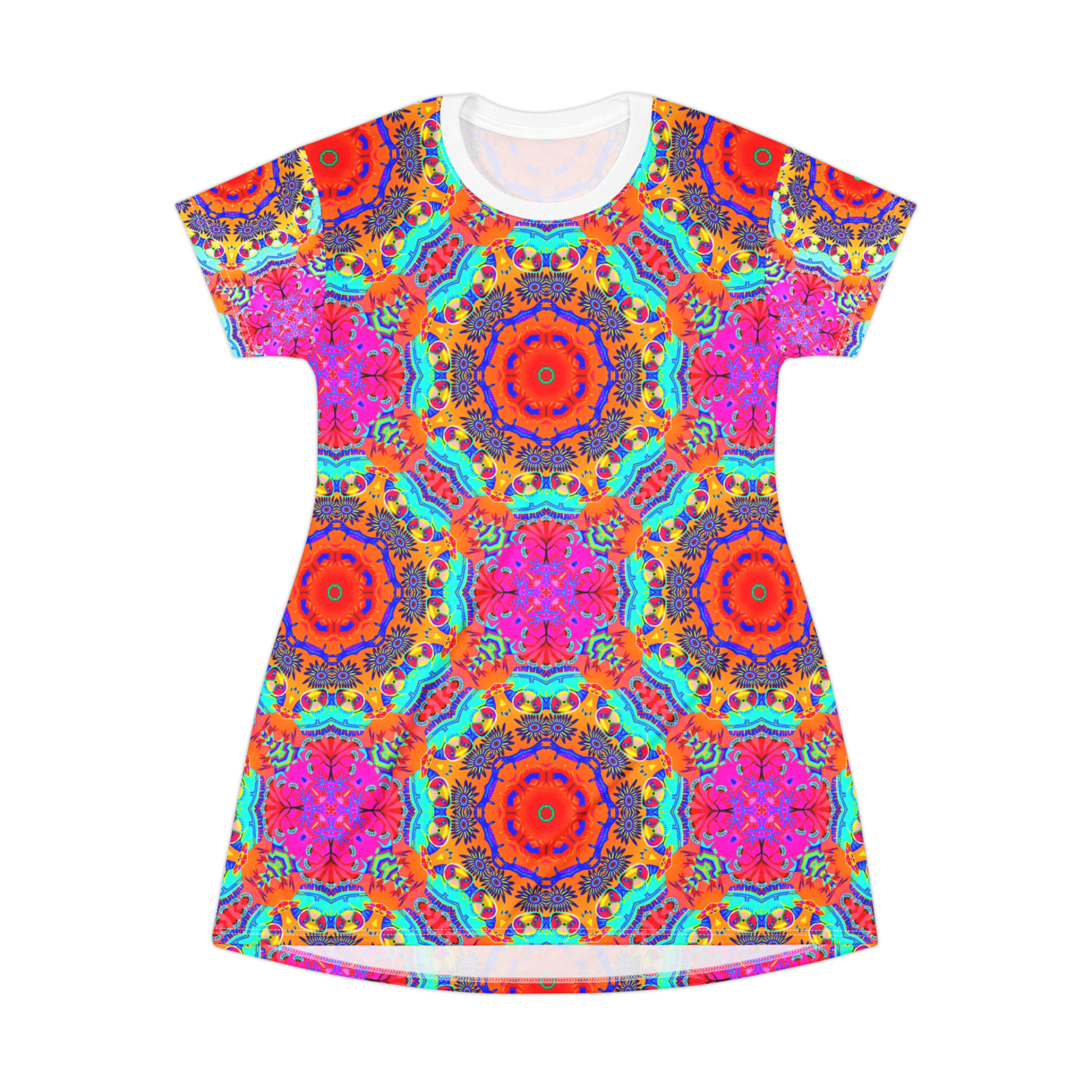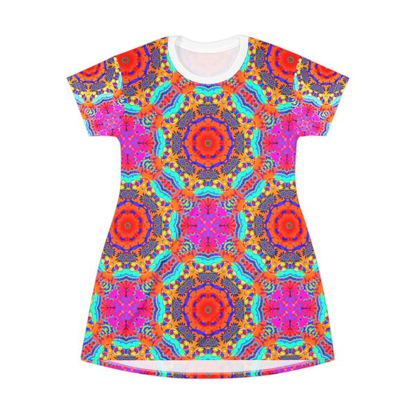 This All-Over-Print T-Shirt Dress is tagless, custom cut and sewn to match every style. This fun coral print will make this t-shirt dress a great piece to wear for many occasions.
