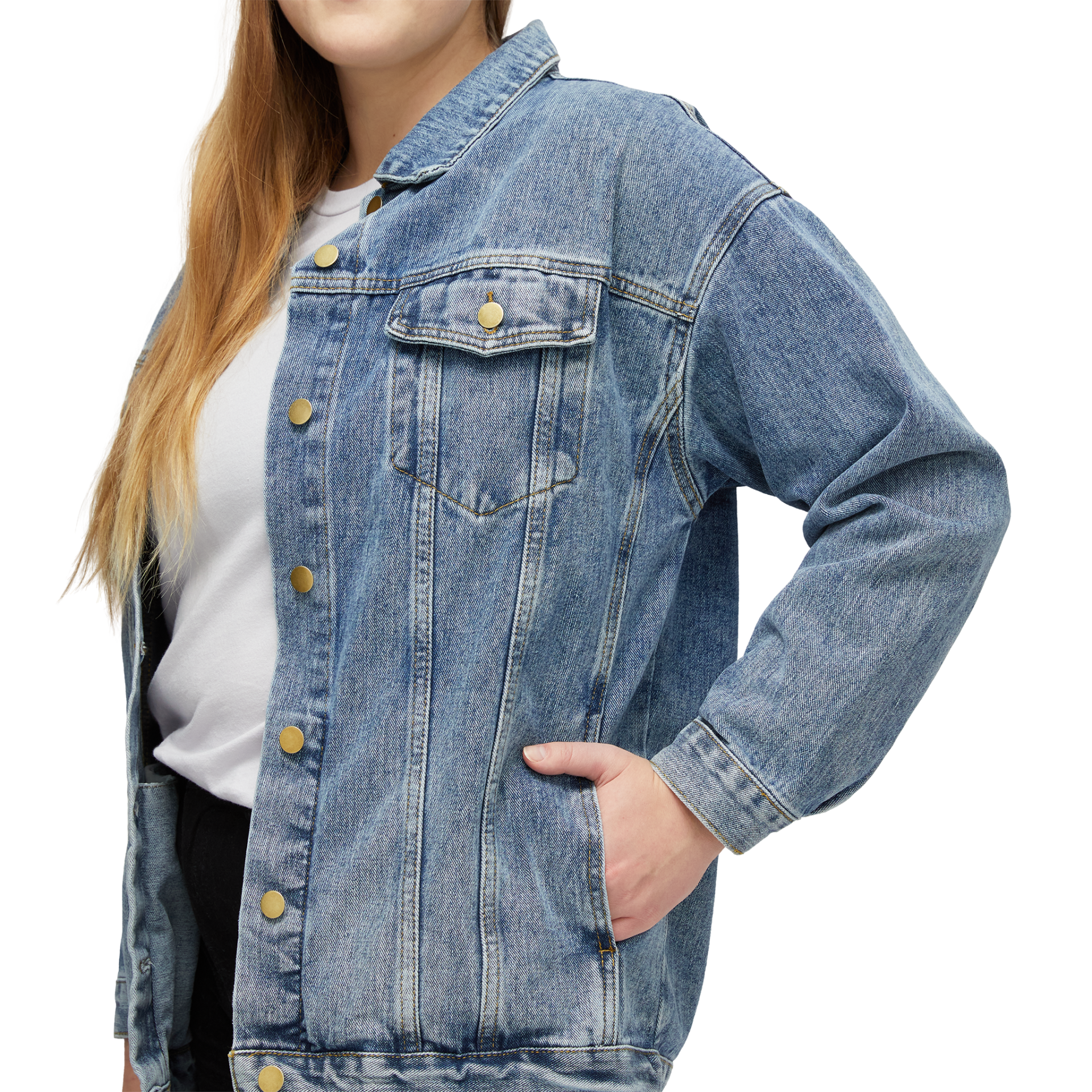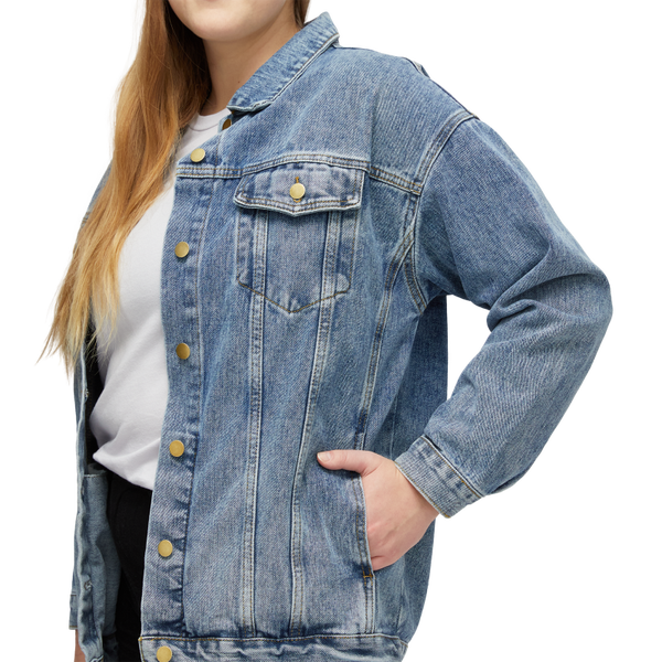 This women's custom denim jacket is here to become a wardrobe icon. With a timeless design, a relaxed, oversized fit, this jacket has all the hallmarks of an instant-favorite; Lapel collar, button-front closure, long sleeves with buttoned cuffs, button-flap front patch pockets, and front slant pockets.